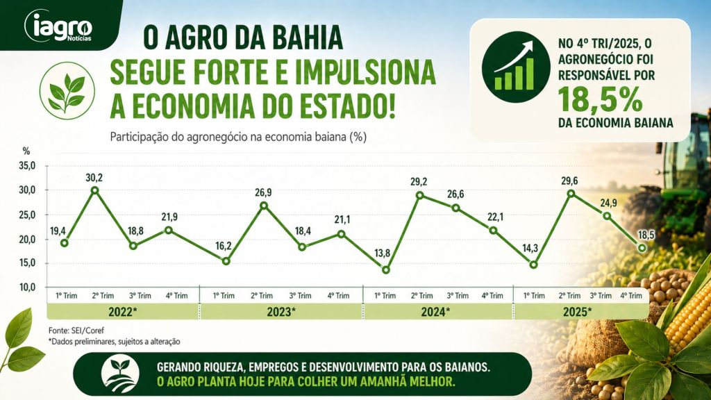 Além dos produtos oriundos das lavouras e rebanhos, outros fatores, como os insumos primários utilizados para dar início à produção, a agroindústria e o transporte e comercialização desses produtos, ajudaram a sustentar o crescimento de 2,7% do PIB total da Bahia, que atingiu R$ 536,7 bilhões em 2025. Enquanto setores como a indústria e os serviços cresceram 2,9% e 1,7%, respectivamente, a agropecuária destacou-se com o maior índice de crescimento setorial (10,3%), reafirmando sua posição estratégica para a estabilidade econômica estadual.